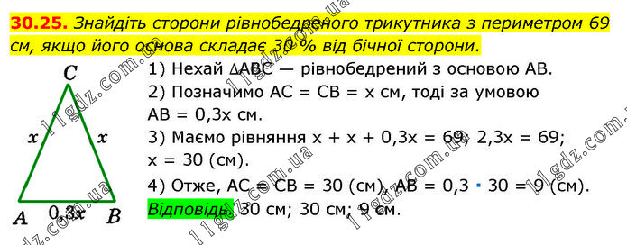 Знайдіть сторони рівнобедреного трикутника з периметром 69 см, якщо його основа складає 30 % від бічної сторони. 1) Нехай ∆ABC — рівнобедрений з основою AB. 2) Позначимо AC = CB = х см, тоді за умовою AB = 0,3x см. 3) Маємо рівняння х + х + 0,3x = 69; 2,3х = 69; х = 30 (см). 4) Отже, AC = CB = 30 (см), AB = 0,3 ∙ 30 = 9 (см). Відповідь. 30 см; 30 см; 9 см.