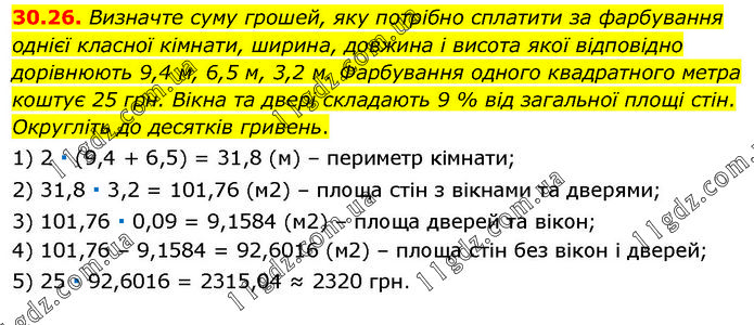 Визначте суму грошей, яку потрібно сплатити за фарбування однієї класної кімнати, ширина, довжина і висота якої відповідно дорівнюють 9,4 м, 6,5 м, 3,2 м. Фарбування одного квадратного метра коштує 25 грн. Вікна та двері складають 9 % від загальної площі стін. Округліть до десятків гривень. 1) 2 ∙ (9,4 + 6,5) = 31,8 (м) – периметр кімнати; 2) 31,8 ∙ 3,2 = 101,76 (м2) – площа стін з вікнами та дверями; 3) 101,76 ∙ 0,09 = 9,1584 (м2) – площа дверей та вікон; 4) 101,76 – 9,1584 = 92,6016 (м2) – площа стін без вікон і дверей; 5) 25 ∙ 92,6016 = 2315,04 ≈ 2320 грн.