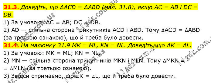 31.3. Доведіть, що ΔACD = ΔABD (мал. 31.8), якщо AC = AB і DC = DB. 1) За умовою: AC = AB; DC = DB. 2) AD — спільна сторона трикутників ACD і ABD. Тому ∆ACD = ∆ABD (за третьою ознакою), що й треба було довести. 31.4. На малюнку 31.9 MK = ML, KN = NL. Доведіть, що AK = AL. 1) За умовою: MK = ML; KN = NL. 2) MN — спільна сторона трикутників MKN і MLN. Тому ∆MKN = = ∆MLN (за третьою ознакою). 3) Звідси отримаємо, що ∠K = ∠L, що й треба було довести.