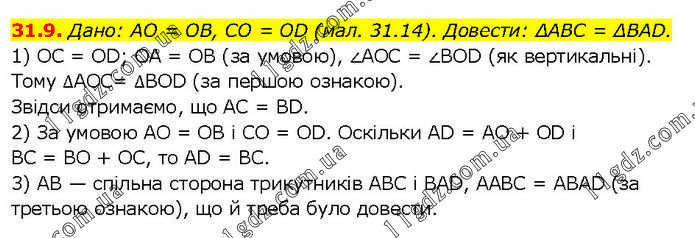 Дано: AO = OB, CO = OD (мал. 31.14). Довести: ΔABC = ΔBAD. 1) OC = OD; OA = OB (за умовою), ∠AOC = ∠BOD (як вертикальні). Тому ∆AOC= ∆BOD (за першою ознакою). Звідси отримаємо, що AC = BD. 2) За умовою AO = OB і CO = OD. Оскільки AD = AO + OD і BC = BO + ОС, то AD = BC. 3) AB — спільна сторона трикутників ABC і BAD, AABC = ABAD (за третьою ознакою), що й треба було довести.