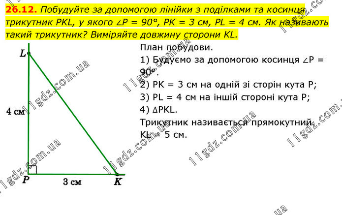 Побудуйте за допомогою лінійки з поділками та косинця трикутник PKL, у якого ∠P = 90°, PK = 3 см, PL = 4 см. Як називають такий трикутник? Виміряйте довжину сторони KL. План побудови. 1) Будуємо за допомогою косинця ∠P = 90°. 2) PK = 3 см на одній зі сторін кута Р; 3) PL = 4 см на іншій стороні кута Р; 4) ∆PKL. Трикутник називається прямокутний. KL = 5 см.