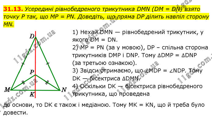 Усередині рівнобедреного трикутника DMN (DM = DN) взято точку P так, що MP = PN. Доведіть, що пряма DP ділить навпіл сторону MN. 1) Нехай DMN — рівнобедрений трикутник, у якого DM = DN. 2) MP = PN (за у мовою), DP – спільна сторона трикутників DMP і DNP. Тому ∆DMP = ∆DNP (за третьою ознакою). 3) Звідси отримаємо, що ∠MDP = ∠NDP. Тому DK — бісектриса ∆DMN. 4) Оскільки DK — бісектриса рівнобедреного трикутника, що проведена до основи, то DK є також і медіаною. Тому MK = KN, що й треба було довести.