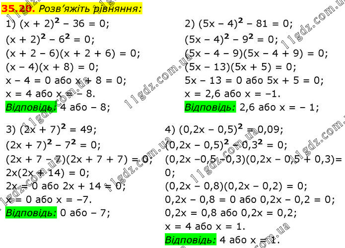 Розв’яжіть рівняння: 1) (x + 2)2 – 36 = 0; (x + 2)2 – 62 = 0; (x + 2 – 6)(x + 2 + 6) = 0; (x – 4)(x + 8) = 0; x – 4 = 0 або x + 8 = 0; x = 4 або x = – 8. Відповідь: 4 або – 8; 2) (5x – 4)2 – 81 = 0; (5x – 4)2 – 92 = 0; (5x – 4 – 9)(5x – 4 + 9) = 0; (5x – 13)(5x + 5) = 0; 5x – 13 = 0 або 5x + 5 = 0; x = 2,6 або x = –1. Відповідь: 2,6 або х = – 1; 3) (2х + 7)2 = 49; (2х + 7)2 – 72 = 0; (2x + 7 – 7)(2х + 7 + 7) = 0; 2x(2x + 14) = 0; 2х = 0 або 2х + 14 = 0; х = 0 або х = –7. Відповідь: 0 або – 7; 4) (0,2х – 0,5)2 = 0,09; (0,2х – 0,5)2 – 0,32 = 0; (0,2x –0,5 –0,3)(0,2x – 0,5 + 0,3)= 0; (0,2х – 0,8)(0,2х – 0,2) = 0; 0,2х – 0,8 = 0 або 0,2х – 0,2 = 0; 0,2х = 0,8 або 0,2х = 0,2; х = 4 або х = 1. Відповідь: 4 або х = 1.