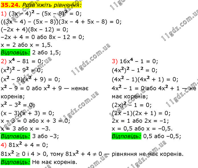 Розв’яжіть рівняння: 1) (3х – 4)2 – (5х – 8)2 = 0; ((3x – 4) – (5x – 8))(3x – 4 + 5x – 8) = 0; (–2x + 4)(8х – 12) = 0; –2х + 4 = 0 або 8х – 12 = 0; х = 2 або х = 1,5. Відповідь: 2 або 1,5; 2) x4 – 81 = 0; (х2)2 – 92 = 0; (х2 – 9)(х2 + 9) = 0; x2 – 9 = 0 або x2 + 9 — немає коренів; x2 – 32 = 0; (х – 3)(х + 3) = 0; х – 3 = 0 або х + 3 = 0; х = 3 або х = –3. Відповідь: 3 або –3; 3) 16x4 – 1 = 0; (4x2)2 – 12 = 0; (4х2 – 1)(4x2 + 1) = 0; 4x2 – 1 = 0 або 4x2 + 1 — не має коренів; (2х)2 – 1 = 0; (2х –1)(2х + 1) = 0; 2х = 1 або 2х = –1; х = 0,5 або х = –0,5. Відповідь: 0,5 або –0,5; 4) 81x2 + 4 = 0; 81x2 ≥ 0 і 4 > 0, тому 81x2 + 4 ≠ 0 — рівняння не має коренів. Відповідь: He має коренів.