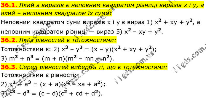 36.1. Який з виразів є неповним квадратом різниці виразів х і у, а який – неповним квадратом їх суми: Неповним квадратом суми виразів х і у є вираз 1) х2 + ху + у2, а неповним квадратом різниці — вираз 5) х2 – ху + у2. 36.2. Які з рівностей є тотожностями: Тотожностями є: 2) х3 – у3 = (х – у)(х2 + ху + у2); 3) m3 + n3 = (m + n)(m2 – mn + n2). 36.3. Серед рівностей виберіть ті, що є тотожностями: Тотожностями є рівності: 2) x3 + a3 = (x + a)(x2 – xa + a2); 3) c3 – d3 = (c – d)(c2 + cd + d2).