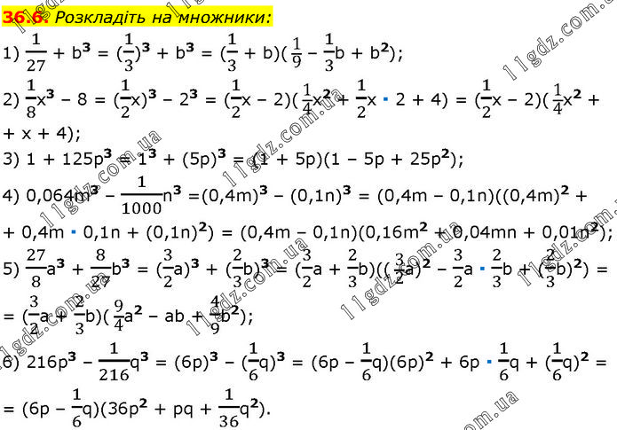 Розкладіть на множники: 1) 1/27 + b3 = (1/3)3 + b3 = (1/3 + b)( 1/9 – 1/3b + b2); 2) 1/8x3 – 8 = (1/2x)3 – 23 = (1/2x – 2)( 1/4x2 + 1/2x ∙ 2 + 4) = (1/2x – 2)( 1/4x2 + x + 4); 3) 1 + 125p3 = 13 + (5р)3 = (1 + 5p)(1 – 5p + 25р2); 4) 0,064m3 – 1/1000n3 =(0,4m)3 – (0,1n)3 = (0,4m – 0,1n)((0,4m)2 + 0,4m ∙ 0,1n + (0,1n)2) = (0,4m – 0,1n)(0,16m2 + 0,04mn + 0,01n2); 5) 27/8a3 + 8/27b3 = (3/2a)3 + (2/3b)3 = (3/2a + 2/3b)(( 3/2a)2 – 3/2a ∙ 2/3b + (2/3b)2) = (3/2a + 2/3b)( 9/4a2 – ab + 4/9b2); 6) 216p3 – 1/216q3 = (6p)3 – (1/6q)3 = (6p – 1/6q)(6p)2 + 6p ∙ 1/6q + (1/6q)2 = (6p – 1/6q)(36p2 + pq + 1/36q2).