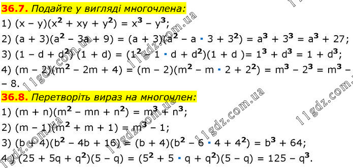 36.7. Подайте у вигляді многочлена: 1) (х – у)(х2 + ху + y2) = x3 – y3; 2) (а + 3)(а2 – 3а + 9) = (а + 3)(а2 – а ∙ 3 + 32) = а3 + 33 = а3 + 27; 3) (1 – d + d2) (1 + d) = (12 – 1 ∙ d + d2)(1 + d )= 13 + d3 = 1 + d3; 4) (m – 2)(m2 – 2m + 4) = (m – 2)(m2 – m ∙ 2 + 22) = m3 – 23 = m3 – 8. 36.8. Перетворіть вираз на многочлен: 1) (m + n)(m2 – mn + n2) = m3 + n3; 2) (m – 1)(m2 + m + 1) = m3 – 1; 3) (b + 4)(b2 – 4b + 16) = (b + 4)(b2 – 6 ∙ 4 + 42) = b3 + 64; 4 ) (25 + 5q + q2)(5 – q) = (52 + 5 ∙ q + q2)(5 – q) = 125 – q3.
