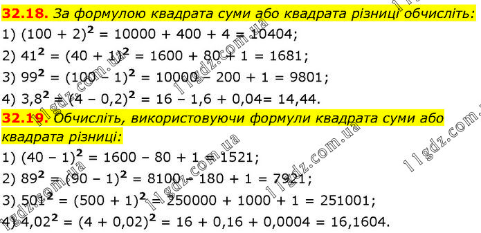 32.18. За формулою квадрата суми або квадрата різниці обчисліть: 1) (100 + 2)2 = 10000 + 400 + 4 = 10404; 2) 412 = (40 + 1)2 = 1600 + 80 + 1 = 1681; 3) 992 = (100 – 1)2 = 10000 – 200 + 1 = 9801; 4) 3,82 = (4 – 0,2)2 = 16 – 1,6 + 0,04= 14,44. 32.19. Обчисліть, використовуючи формули квадрата суми або квадрата різниці: 1) (40 – 1)2 = 1600 – 80 + 1 = 1521; 2) 892 = (90 – 1)2 = 8100 – 180 + 1 = 7921; 3) 5012 = (500 + 1)2 = 250000 + 1000 + 1 = 251001; 4) 4,022 = (4 + 0,02)2 = 16 + 0,16 + 0,0004 = 16,1604.