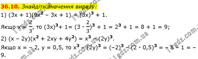Знайдіть значення виразу: 1) (3x + 1)(9x2 – 3x + 1) = (3х)3 + 1. Якщо х = 2/3, то (3х)3+ 1= (3 ∙ 2/3)3 + 1 = 23 + 1 = 8 + 1 = 9; 2) (x – 2y)(x2 + 2xy + 4y2) = x3 – (2y)3. Якщо x = – 2, у = 0,5, то x3 – (2y)3 = (–2)3 – (2 ∙ 0,5)3 = – 8 – 1 = – 9.