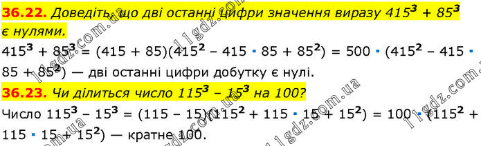 36.22. Доведіть, що дві останні цифри значення виразу 4153 + 853 є нулями. 4153 + 853 = (415 + 85)(4152 – 415 ∙ 85 + 852) = 500 ∙ (4152 – 415 ∙ 85 + 852) — дві останні цифри добутку є нулі. 36.23. Чи ділиться число 1153 – 153 на 100? Число 1153 – 153 = (115 – 15)(1152 + 115 ∙ 15 + 152) = 100 ∙ (1152 + 115 ∙ 15 + 152) — кратне 100.