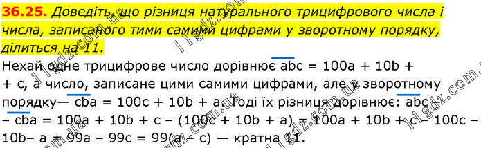 Доведіть, що різниця натурального трицифрового числа і числа, записаного тими самими цифрами у зворотному порядку, ділиться на 11. Нехай одне трицифрове число дорівнює abc = 100а + 10b + с, а число, записане цими самими цифрами, але у зворотному порядку — cba = 100с + 10b + а. Тоді їх різниця дорівнює: abc – cba = 100а + 10b + с – (100с + 10b + а) = 100а + 10b + с – 100с – 10b– а = 99а – 99с = 99(а – с) — кратна 11.