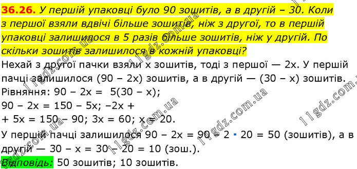 У першій упаковці було 90 зошитів, а в другій – 30. Коли з першої взяли вдвічі більше зошитів, ніж з другої, то в першій упаковці залишилося в 5 разів більше зошитів, ніж у другій. По скільки зошитів залишилося в кожній упаковці? Нехай з другої пачки взяли х зошитів, тоді з першої — 2х. У першій пачці залишилося (90 – 2х) зошитів, а в другій — (30 – х) зошитів. Рівняння: 90 – 2х = 5(30 – х); 90 – 2x = 150 – 5х; –2х + 5х = 150 – 90; 3х = 60; х = 20. У першій пачці залишилося 90 – 2х = 90 – 2 ∙ 20 = 50 (зошитів), а в другій — 30 – х = 30 – 20 = 10 (зош.). Відповідь: 50 зошитів; 10 зошитів.