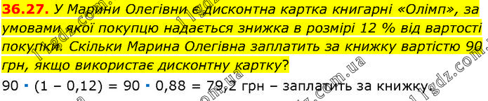 У Марини Олегівни є дисконтна картка книгарні «Олімп», за умовами якої покупцю надається знижка в розмірі 12 % від вартості покупки. Скільки Марина Олегівна заплатить за книжку вартістю 90 грн, якщо використає дисконтну картку? 90 ∙ (1 – 0,12) = 90 ∙ 0,88 = 79,2 грн – заплатить за книжку.