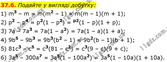 Подайте у вигляді добутку: 1) m3 – m = m(m2 – 1) = m(m – 1)(m + 1); 2) p2 – p4 = p2(1 – p2) = р2(1 – р)(1 + р); 3) 7а – 7а3 = 7а(1 – а2) = 7а(1 – а)(1 + а); 4) 9b5 – 9b3 = 9b3(b2 – 1) = 9b2(b – 1)(b + 1); 5) 81с3 – с5 = с3(81 – с2) = с3(9 – с)(9 + с); 6) 3а5 – 300а7 = 3а5(1 – 100а2) = 3а5(1 – 10а)(1 + 10а).