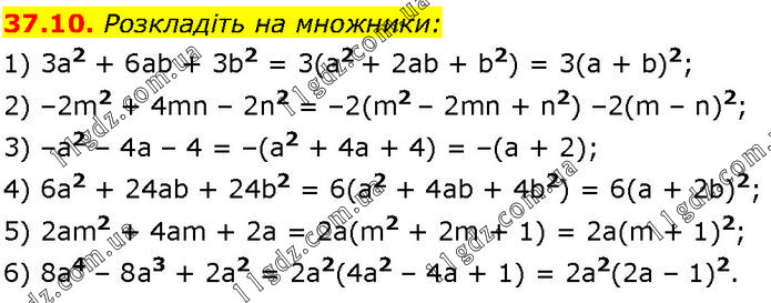Розкладіть на множники: 1) 3а2 + 6аb + 3b2 = 3(а2 + 2аb + b2) = 3(а + b)2; 2) –2m2 + 4mn – 2n2 = –2(m2 – 2mn + n2) – 2(m – n)2; 3) –a2 – 4a – 4 = –(а2 + 4а + 4) = –(а + 2); 4) 6а2 + 24аb + 24b2 = 6(а2 + 4ab + 4b2) = 6(а + 2b)2; 5) 2am2 + 4am + 2а = 2а(m2 + 2m + 1) = 2а(m + 1)2; 6) 8а4 – 8а3 + 2а2 = 2а2(4а2 – 4а + 1) = 2а2(2а – 1)2.