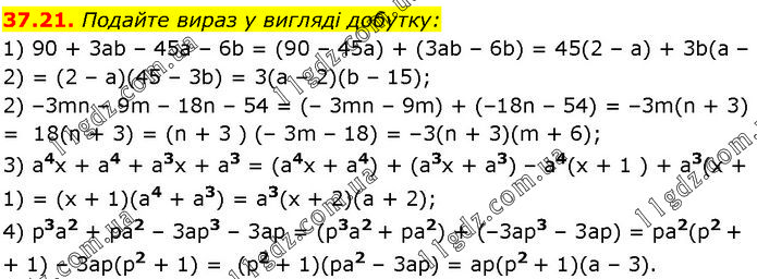 Подайте вираз у вигляді добутку: 1) 90 + 3аb – 45а – 6b = (90 – 45а) + (3аb – 6b) = 45(2 – а) + 3b(а – 2) = (2 – а)(45 – 3b) = 3(а – 2)(b – 15); 2) –3mn – 9m – 18n – 54 = (– 3mn – 9m) + (–18n – 54) = –3m(n + 3) = 18(n + 3) = (n + 3 ) (– 3m – 18) = –3(n + 3)(m + 6); 3) a4x + a4 + a3x + а3 = (a4x + a4) + (a3x + a3) – a4(x + 1 ) + a3(x + 1) = (x + 1)(a4 + a3) = a3(x + 2)(a + 2); 4) p3a2 + pa2 – 3ар3 – 3ap = (p3a2 + pa2) + (–3ap3 – 3ap) = ра2(p2 + 1) – 3ap(p2 + 1) = (p2 + 1)(pa2 – 3ap) = ap(p2 + 1)(a – 3).