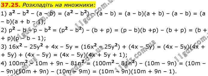 Розкладіть на множники: 1) a2 – b2 – (a – b) = (a2 – b2) – (a – b) = (a – b)(a + b) – (a – b) = (a – b)(a + b – 1); 2) p2 – b – p – b2 = (p2 – b2) – (b + p) = (p – b)(b +p) – (b + p) = (b + p)(p – b – 1); 3) 16x2 – 25y2 + 4x – 5y = (16x2 – 25y2) + (4x – 5y) = (4x – 5y)(4x + 5y) + (4x – 5y) = (4x – 5y)(4x + 5y + 1); 4) 100m2 – 10m + 9n – 81n2 = (100m2 – 81n2) – (10m – 9n) = (10m – 9n)(10m + 9n) – (10m – 9m) = (10m – 9n)(10m + 9n – 1).