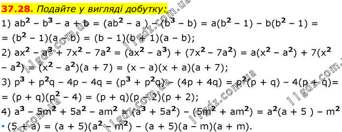 Подайте у вигляді добутку: 1) ab2 – b3 – a + b = (ab2 – а ) – (b3 – b) = а(b2 – 1) – b(b2 – 1) = (b2 – 1)(а – b) = (b – 1)(b + 1)(a – b); 2) ах2 – а3 + 7x2 – 7a2 = (ах2 – а3) + (7x2 – 7a2) = а(х2 – а2) + 7(х2 – а2) = (х2 – а2)(а + 7) = (х – а)(х + а)(а + 7); 3) p3 + p2q – 4p – 4q = (p3 + p2q) – (4р + 4q) = р2(р + q) – 4(р + q) = (р + q)(p2 – 4) = (p + q)(p – 2)(р + 2); 4) а3 – 5m2 + 5a2 – am2 = (а3 + 5a2) – (5m2 + am2) = а2(а + 5 ) – m2 ∙ (5 + а) = (а + 5)(a2 – m2) – (а + 5)(а – m)(а + m).