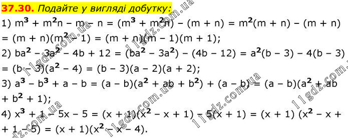 Подайте у вигляді добутку: 1) m3 + m2n – m – n = (m3 + m2n) – (m + n) = m2(m + n) – (m + n) = (m + n)(m2 – 1) = (m + n)(m – 1)(m + 1); 2) ba2 – 3a2 – 4b + 12 = (ba2 – 3a2) – (4b – 12) = a2(b – 3) – 4(b – 3) = (b – 3)(a2 – 4) = (b – 3)(a – 2)(a + 2); 3) a3 – b3 + a – b = (a – b)(a2 + ab + b2) + (a – b) = (a – b)(a2 + ab + b2 + 1); 4) x3 + 1 – 5x – 5 = (x + 1)(x2 – x + 1) – 5(x + 1) = (x + 1) (x2 – x + 1 – 5) = (x + 1)(x2 – x – 4).
