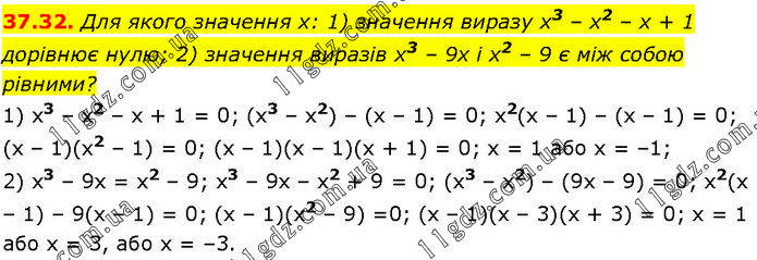 Для якого значення х: 1) значення виразу х3 – х2 – х + 1 дорівнює нулю; 2) значення виразів х3 – 9х і х2 – 9 є між собою рівними? 1) x3 – x2 – x + 1 = 0; (x3 – x2) – (x – 1) = 0; х2(х – 1) – (x – 1) = 0; (х – 1)(х2 – 1) = 0; (х – 1)(x – 1)(x + 1) = 0; х = 1 або х = –1; 2) x3 – 9х = х2 – 9; х3 – 9х – х2 + 9 = 0; (х3 – х2) – (9х – 9) = 0; х2(х – 1) – 9(х – 1) = 0; (х – 1)(x2 – 9) =0; (х – 1)(х – 3)(х + 3) = 0; х = 1 або х = 3, або х = –3.