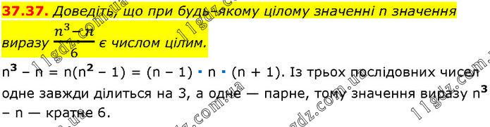 Доведіть, що при будь–якому цілому значенні n значення виразу (n^3- n)/6 є числом цілим. n3 – n = n(n2 – 1) = (n – 1) ∙ n ∙ (n + 1). Із трьох послідовних чисел одне завжди ділиться на 3, а одне — парне, тому значення виразу n3 – n — кратне 6.