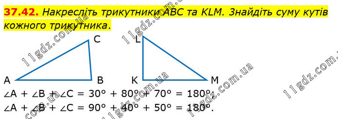Накреслiть трикутники АВС та KLM. 3найдiть суму кутiв кожного трикутника. ∠A + ∠B + ∠C = 30° + 80° + 70° = 180°; ∠A + ∠B + ∠C = 90° + 40° + 50° = 180°.