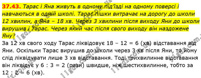 Тарас і Яна живуть в одному під’їзді на одному поверсі і навчаються в одній школі. Тарас пішки витрачає на дорогу до школи 12 хвилин, а Яна – 18 хв. Через 3 хвилини після виходу Яни до школи вирушив і Тарас. Через який час після свого виходу він наздожене Яну? За 12 хв свого ходу Тарас ліквідовує 18 – 12 = 6 (хв) відставання від Яни. Оскільки Тарас вирушив до школи через 3 хв після Яни, то йому слід ліквідувати лише 3 хв відставання. Тоді трихвилинне відставання він ліквідує у 6 : 3 = 2 (рази) швидше, ніж шестихвилинне, тобто за 12 : 2 = 6 (хв).