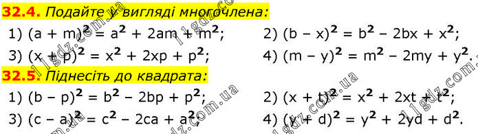 32.4. Подайте у вигляді многочлена: 1) (а + m)2 = а2 + 2аm + m2; 3) (x + p)2 = x2 + 2xp + p2; 2) (b – х)2 = b2 – 2bх + x2; 4) (m – у)2 = m2 – 2mу + у2. 32.5. Піднесіть до квадрата: 1) (b – p)2 = b2 – 2bp + p2; 3) (c – a)2 = c2 – 2ca + a2; 2) (х + t)2 = х2 + 2xt + t2; 4) (y + d)2 = y2 + 2yd + d2.