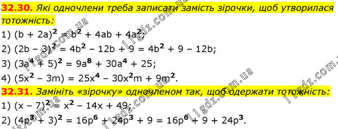 32.30. Які одночлени треба записати замість зірочки, щоб утворилася тотожність: 1) (b + 2a)2 = b2 + 4ab + 4a2; 2) (2b – 3)2 = 4b2 – 12b + 9 = 4b2 + 9 – 12b; 3) (3a4 + 5)2 = 9a8 + 30a4 + 25; 4) (5x2 – 3m) = 25x4 – 30x2m + 9m2. 32.31. Замініть «зірочку» одночленом так, щоб одержати тотожність: 1) (x – 7)2 = x2 – 14x + 49; 2) (4p3 + 3)2 = 16p6 + 24р3 + 9 = 16p6 + 9 + 24p3.