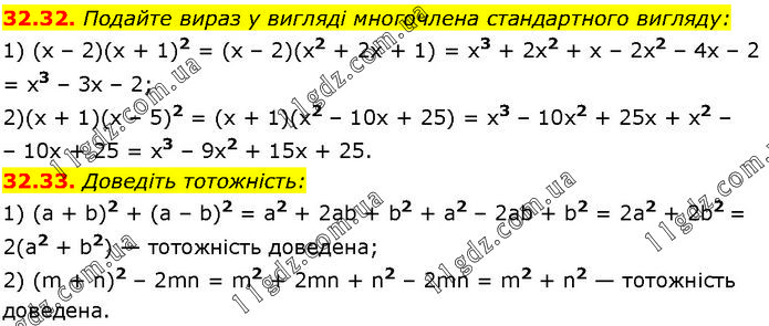 32.32. Подайте вираз у вигляді многочлена стандартного вигляду: 1) (х – 2)(х + 1)2 = (х – 2)(x2 + 2x + 1) = x3 + 2х2 + х – 2x2 – 4x – 2 = x3 – 3x – 2; 2) (x + 1)(x – 5)2 = (x + 1)(x2 – 10x + 25) = x3 – 10x2 + 25x + x2 – 10x + 25 = x3 – 9х2 + 15x + 25. 32.33. Доведіть тотожність: 1) (a + b)2 + (a – b)2 = a2 + 2ab + b2 + a2 – 2ab + b2 = 2a2 + 2b2 = 2(a2 + b2) — тотожність доведена; 2) (m + n)2 – 2mn = m2 + 2mn + n2 – 2mn = m2 + n2 — тотожність доведена.