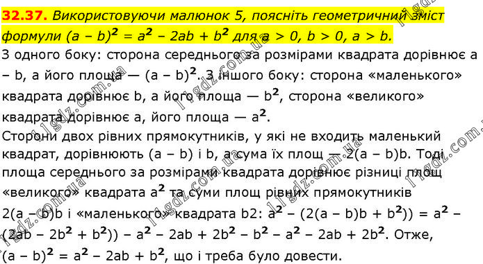 Використовуючи малюнок 5, поясніть геометричний зміст формули (а – b)2 = а2 – 2ab + b2 для а > 0, b > 0, а > b. З одного боку: сторона середнього за розмірами квадрата дорівнює а – b, а його площа — (a – b)2. З іншого боку: сторона «маленького» квадрата дорівнює b, а його площа — b2, сторона «великого» квадрата дорівнює а, його площа — a2. Сторони двох рівних прямокутників, у які не входить маленький квадрат, дорівнюють (а – b) і b, а сума їх площ — 2(а – b)b. Тоді площа середнього за розмірами квадрата дорівнює різниці площ «великого» квадрата а2 та суми площ рівних прямокутників 2(а – b)b і «маленького» квадрата b2: а2 – (2(а – b)b + b2)) = а2 – (2ab – 2b2 + b2)) – a2 – 2ab + 2b2 – b2 – a2 – 2ab + 2b2. Отже, (a – b)2 = a2 – 2ab + b2, що і треба було довести.