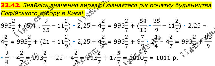 Знайдіть значення виразу і дізнаєтеся рік початку будівництва Софійського собору в Києві. 9932/7 + (5,4 : 9/35 – 112/9) ∙ 2,25 – 42/7 = 9932/7 + (54/10 ∙ 35/9 – 112/9) ∙ 2,25 – 42/7 = 9932/7 + (21 – 112/9) ∙ 2,25 – 42/7 = 9932/7 + 97/9 ∙ 21/4 – 42/7 = 9932/7 + 88/9 ∙ 9/4 – 42/7 = 9932/7 + 22 – 42/7 = 9932/7 + 175/7 = 10107/7 = 1011 р.