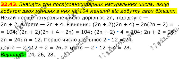 Знайдіть три послідовних парних натуральних числа, якщо добуток двох менших з них на 104 менший від добутку двох більших. Нехай перше натуральне число дорівнює 2n, тоді друге — 2n + 2, а третє — 2n + 4. Рівняння: (2n + 2)(2n + 4) – 2n(2n + 2) = 104; (2n + 2)(2n + 4 – 2n) = 104; (2n + 2) ∙ 4 = 104; 2n + 2 = 26; 2n = 24; n = 12. Перше число дорівнює 2 ∙ 12 = 24, друге — 2 ∙ 12 + 2 = 26, а третє — 2 ∙ 12 + 4 = 28. Відповідь: 24, 26, 28.