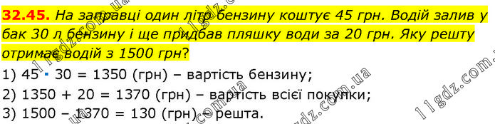 На заправці один літр бензину коштує 45 грн. Водій залив у бак 30 л бензину і ще придбав пляшку води за 20 грн. Яку решту отримає водій з 1500 грн? 1) 45 ∙ 30 = 1350 (грн) – вартість бензину; 2) 1350 + 20 = 1370 (грн) – вартість всієї покупки; 3) 1500 – 1370 = 130 (грн) – решта.