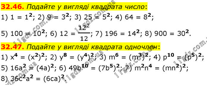 32.46. Подайте у вигляді квадрата число: 1) 1 = 12; 2) 9 = 32; 3) 25 = 52; 4) 64 = 82; 5) 100 = 102; 6) 12 = 12^2/12; 7) 196 = 142; 8) 900 = 302. 32.47. Подайте у вигляді квадрата одночлен: 1) х4 = (х2)2; 2) у8 = (у4)2; 3) m6 = (m3)2; 4) р10 = (p5)2; 5) 16а2 = (4a)2; 6) 49b10 = (7b5)2; 7) m2n4 = (mn2)2; 8) 36с2а2 = (6ca)2.
