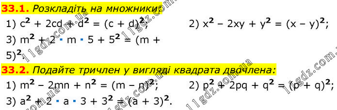 33.1. Розкладіть на множники: 1) с2 + 2cd + d2 = (c + d)2; 3) m2 + 2 ∙ m ∙ 5 + 52 = (m + 5)2. 2) x2 – 2xy + y2 = (x – y)2; 33.2. Подайте тричлен у вигляді квадрата двочлена: 1) m2 – 2mn + n2 = (m – n)2; 3) a2 + 2 ∙ a ∙ 3 + 32 = (a + 3)2. 2) p2 + 2pq + q2 = (p + q)2;