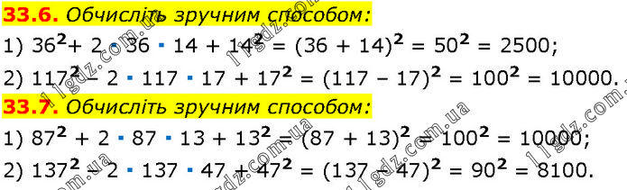 33.6. Обчисліть зручним способом: 1) 362+ 2 ∙ 36 ∙ 14 + 142 = (36 + 14)2 = 502 = 2500; 2) 1172 – 2 ∙ 117 ∙ 17 + 172 = (117 – 17)2 = 1002 = 10000. 33.7. Обчисліть зручним способом: 1) 872 + 2 ∙ 87 ∙ 13 + 132 = (87 + 13)2 = 1002 = 10000; 2) 1372 – 2 ∙ 137 ∙ 47 + 472 = (137 – 47)2 = 902 = 8100.