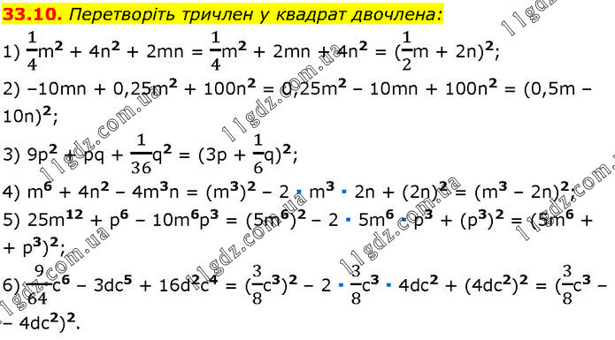 Перетворіть тричлен у квадрат двочлена: 1) 1/4m2 + 4n2 + 2mn = 1/4m2 + 2mn + 4n2 = (1/2m + 2n)2; 2) –10mn + 0,25m2 + 100n2 = 0,25m2 – 10mn + 100n2 = (0,5m – 10n)2; 3) 9p2 + pq + 1/36q2 = (3p + 1/6q)2; 4) m6 + 4n2 – 4m3n = (m3)2 – 2 ∙ m3 ∙ 2n + (2n)2 = (m3 – 2n)2; 5) 25m12 + p6 – 10m6p3 = (5m6)2 – 2 ∙ 5m6 ∙ p3 + (p3)2 = (5m6 + p3)2; 6) 9/(64 )c6 – 3dc5 + 16d2c4 = (3/8c3)2 – 2 ∙ 3/8c3 ∙ 4dc2 + (4dc2)2 = (3/8c3 – 4dc2)2.