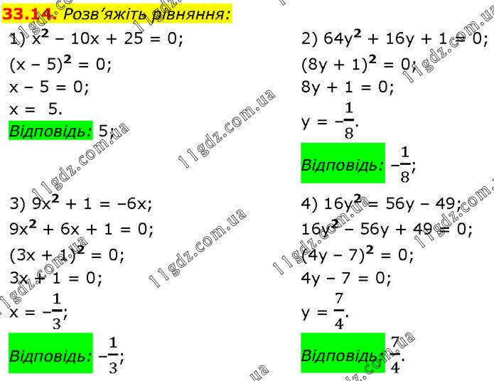 Розв’яжіть рівняння: 1) x2 – 10x + 25 = 0; (x – 5)2 = 0; x – 5 = 0; x = 5. Відповідь: 5; 2) 64y2 + 16y + 1 = 0; (8y + 1)2 = 0; 8y + 1 = 0; y = –1/8. Відповідь: –1/8; 3) 9x2 + 1 = –6x; 9x2 + 6x + 1 = 0; (3x + 1)2 = 0; 3x + 1 = 0; x = –1/3; Відповідь: –1/3; 4) 16y2 = 56y – 49; 16y2 – 56y + 49 = 0; (4y – 7)2 = 0; 4y – 7 = 0; y = 7/4. Відповідь: 7/4.
