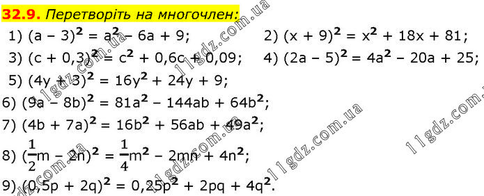 Перетворіть на многочлен: 1) (а – 3)2 = а2 – 6а + 9; 3) (с + 0,3)2 = с2 + 0,6с + 0,09; 5) (4у + 3)2 = 16у2 + 24у + 9; 2) (х + 9)2 = х2 + 18х + 81; 4) (2а – 5)2 = 4а2 – 20а + 25; 6) (9а – 8b)2 = 81а2 – 144ab + 64b2; 7) (4b + 7а)2 = 16b2 + 56ab + 49а2; 8) (1/2m – 2n)2 = 1/4m2 – 2mn + 4n2; 9) (0,5p + 2q)2 = 0,25p2 + 2pq + 4q2.