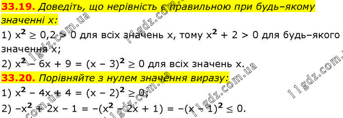 33.19. Доведіть, що нерівність є правильною при будь–якому значенні х: 1) x2 ≥ 0,2 > 0 для всіх значень х, тому х2 + 2 > 0 для будь–якого значення х; 2) x2 – 6х + 9 = (х – 3)2 ≥ 0 для всіх значень х. 33.20. Порівняйте з нулем значення виразу: 1) x2 – 4х + 4 = (х – 2)2 ≥ 0; 2) –x2 + 2х – 1 = –(х2 – 2х + 1) = –(х – 1)2 ≤ 0.