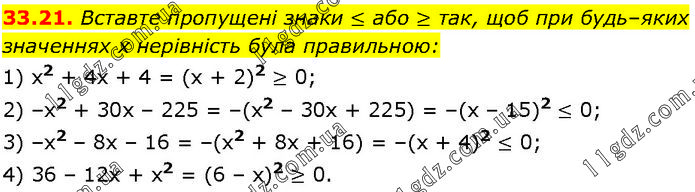 Вставте пропущені знаки ≤ або ≥ так, щоб при будь–яких значеннях х нерівність була правильною: 1) x2 + 4х + 4 = (х + 2)2 ≥ 0; 2) –x2 + 30х – 225 = –(х2 – 30х + 225) = –(х – 15)2 ≤ 0; 3) –x2 – 8х – 16 = –(х2 + 8х + 16) = –(x + 4)2 ≤ 0; 4) 36 – 12х + х2 = (6 – х)2 ≥ 0.