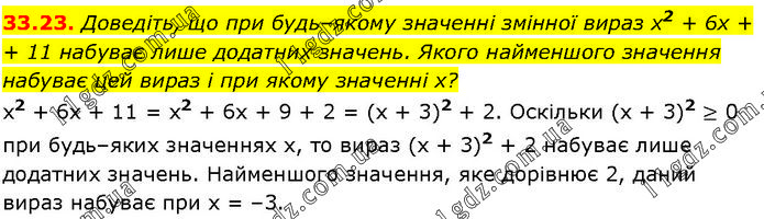 Доведіть, що при будь–якому значенні змінної вираз x2 + 6х + 11 набуває лише додатних значень. Якого найменшого значення набуває цей вираз і при якому значенні х? x2 + 6х + 11 = x2 + 6х + 9 + 2 = (х + 3)2 + 2. Оскільки (х + 3)2 ≥ 0 при будь–яких значеннях х, то вираз (х + 3)2 + 2 набуває лише додатних значень. Найменшого значення, яке дорівнює 2, даний вираз набуває при х = –3.