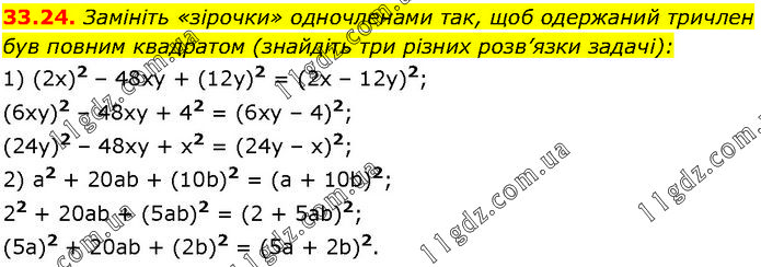 Замініть «зірочки» одночленами так, щоб одержаний тричлен був повним квадратом (знайдіть три різних розв’язки задачі): 1) (2х)2 – 48ху + (12у)2 = (2х – 12у)2; (6ху)2 – 48ху + 42 = (6ху – 4)2; (24у)2 – 48ху + x2 = (24у – х)2; 2) а2 + 20ab + (10b)2 = (а + 10b)2; 22 + 20ab + (5ab)2 = (2 + 5ab)2; (5а)2 + 20ab + (2b)2 = (5a + 2b)2.