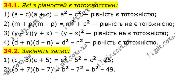 34.1. Які з рівностей є тотожностями: 1) (а – с)(а + с) = а2 – с2 — рівність є тотожністю; 2) (m + р)(m – р) = m2 + р2 — рівність не є тотожністю; 3) (y – х)(y + х) = (y – х)2 — рівність не є тотожністю; 4) (d + n)(d – n) = d2 – n2 — рівність є тотожністю. 34.2. Закінчіть запис: 1) (c – 5)(c + 5) = c2 – 52 = c2 – 25; 2) (b + 7)(b – 7) = b2 – 72 = b2 – 49.