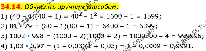Обчисліть зручним способом: 1) (40 – 1)(40 + 1) = 402 – 12 = 1600 – 1 = 1599; 2) 81 ∙ 79 = (80 – 1)(80 + 1) = 6400 – 1 = 6399; 3) 1002 ∙ 998 = (1000 – 2)(1000 + 2) = 1000000 – 4 = 999996; 4) 1,03 ∙ 0,97 = (1 – 0,03)(1 + 0,03) = 1 – 0,0009 = 0,9991.