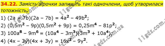Замість зірочки запишіть такі одночлени, щоб утворилася тотожність: 1) (2а + 7b)(2а – 7b) = 4а2 – 49b2; 2) (0,5m2 – 9р)(0,5m2 + 9р) = 0,25m4 – 81p2; 3) 100а8 – 9m6 = (10а4 – 3m3)(3m3 + 10а4); 4) (4х – 3у)(4х + 3у) = 16х2 – 9y2.