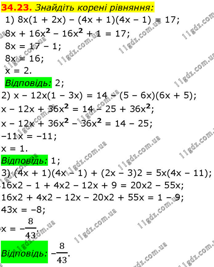 Знайдіть корені рівняння: 1) 8х(1 + 2х) – (4х + 1)(4х – 1) = 17; 8х + 16х2 – 16х2 + 1 = 17; 8х = 17 – 1; 8х = 16; х = 2. Відповідь: 2; 2) х – 12х(1 – 3х) = 14 – (5 – 6х)(6х + 5); х – 12х + 36х2 = 14 – 25 + 36х2; х – 12х + 36х2 – 36х2 = 14 – 25; –11x = –11; х = 1. Відповідь: 1; 3) (4х + 1)(4х – 1) + (2х – 3)2 = 5х(4х – 11); 16х2 – 1 + 4х2 – 12х + 9 = 20x2 – 55x; 16x2 + 4х2 – 12х – 20x2 + 55х = 1 – 9; 43x = –8; x = –8/43. Відповідь: –8/43.