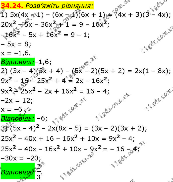 Розв’яжіть рівняння: 1) 5x(4x – 1) – (6х – 1)(6х + 1) = (4х + 3)(3 – 4x); 20x2 – 5x – 36x2 + 1 = 9 – 16х2; –16х2 – 5х + 16x2 = 9 – 1; – 5x = 8; х = –1,6. Відповідь:–1,6; 2) (3х – 4)(3х + 4) – (5х – 2)(5x + 2) = 2х(1 – 8х); 9x2 – 16 – 25x2 + 4 = 2х – 16х2; 9х2 – 25x2 – 2х + 16x2 = 16 – 4; –2х = 12; х = –6 . Відповідь: –6; 3) (5х – 4)2 – 2х(8х – 5) = (3х – 2)(3х + 2); 25х2 – 40х + 16 – 16x2 + 10x = 9х2 – 4; 25х2 – 40х – 16x2 + 10x – 9x2 = – 16 – 4; –30х = –20; Відповідь: 2/3.