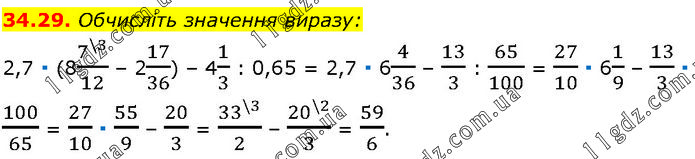 Обчисліть значення виразу: 2,7 ∙ (87^(\3)/12 – 217/36) – 41/3 : 0,65 = 2,7 ∙ 64/36 – 13/3 : 65/100 = 27/10 ∙ 61/9 – 13/3 ∙ 100/65 = 27/10 ∙ 55/9 – 20/3 = 33^(\3)/2 – 20^(\2)/3 = 59/6.